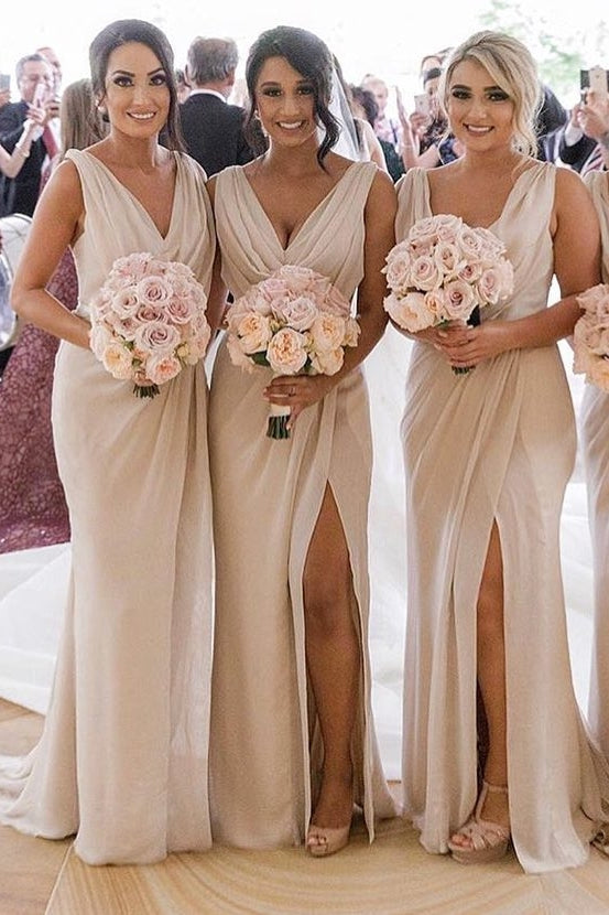 Champagne Deep V-Neck Side Slit Sleeveless Bridesmaid Dress