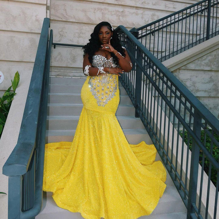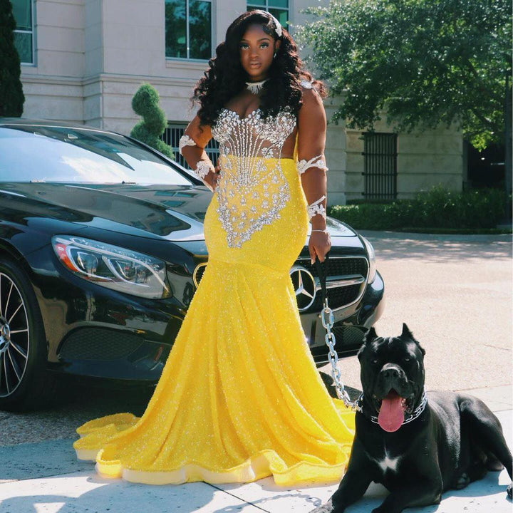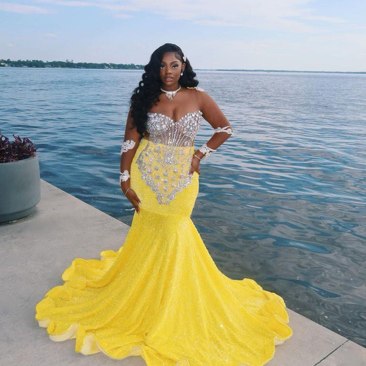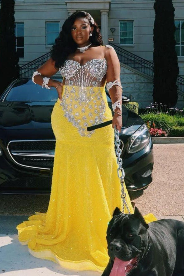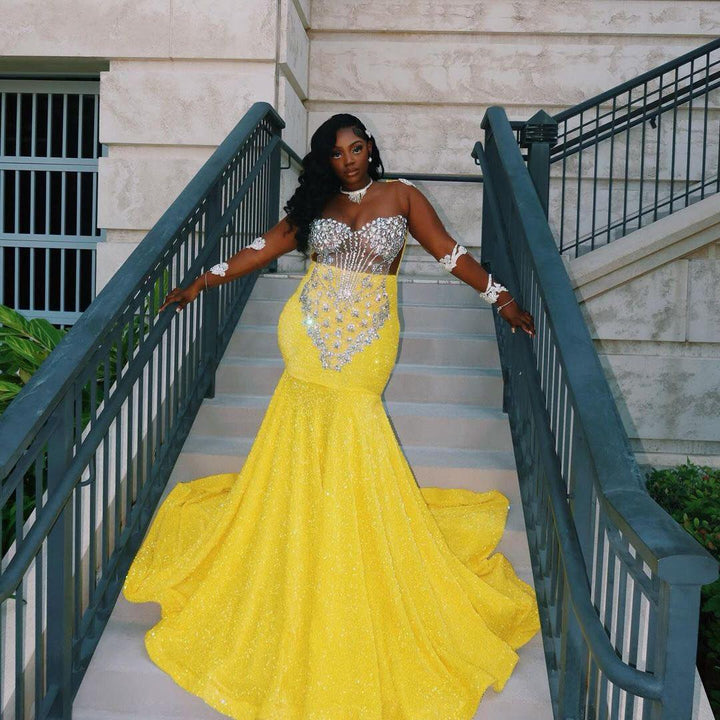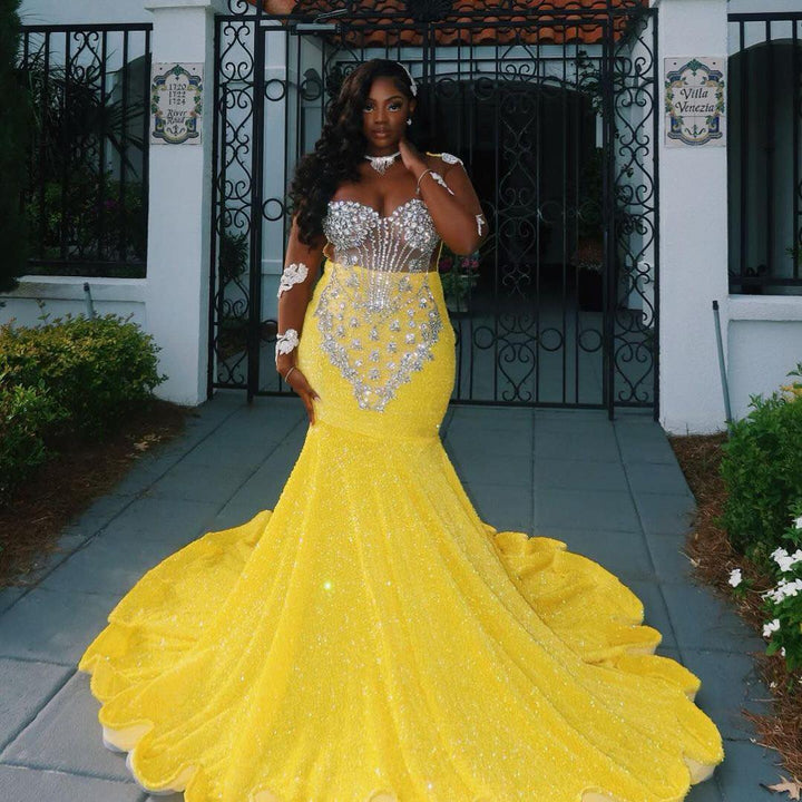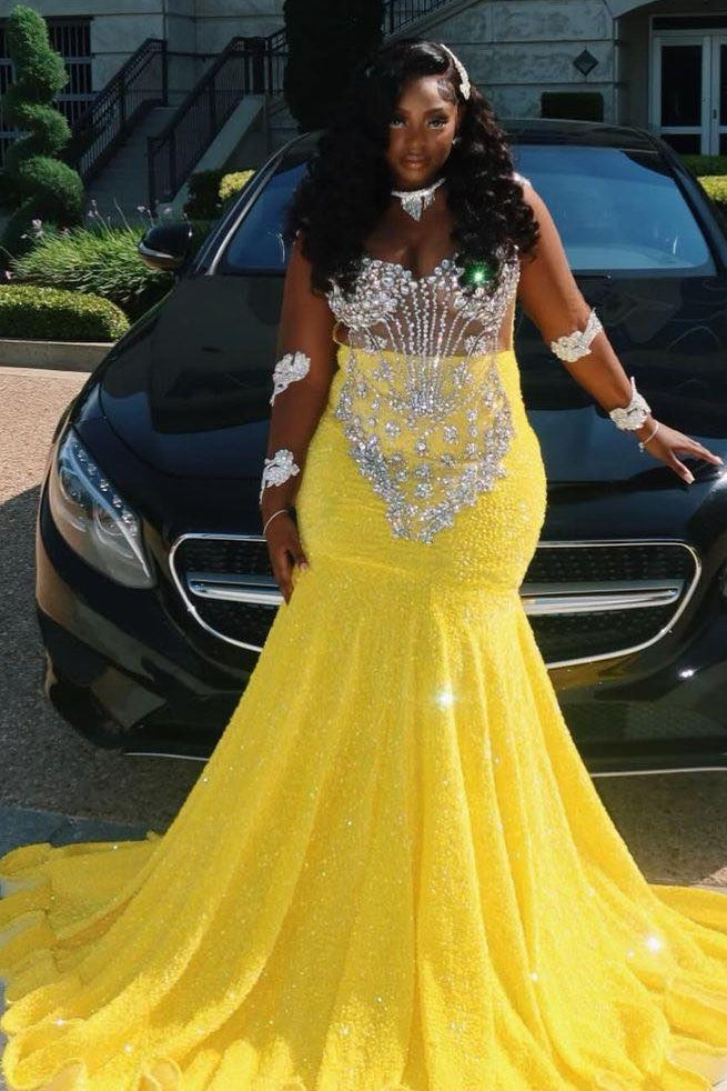Fashion Yellow Sequins Sheer Tulle Long Sleeves Prom Dress