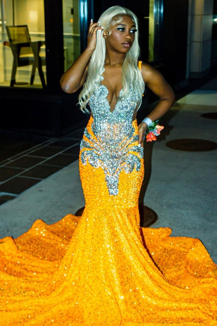 Yellow Mermaid Sequins Sleeveless Prom Dress with Crystal