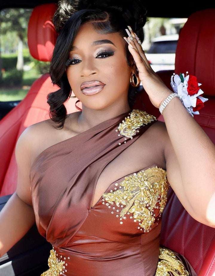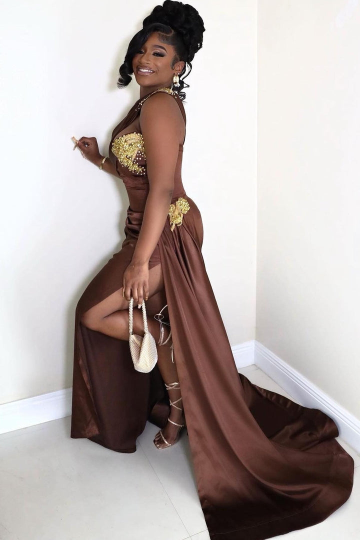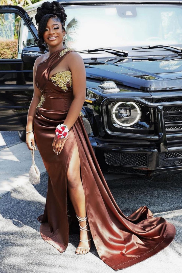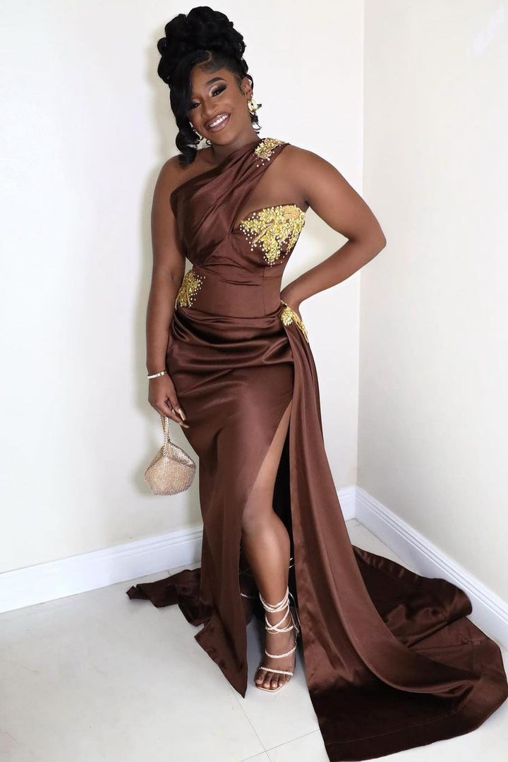 Chic Brown One Shoulder Appliques Side Slit Prom Dress
