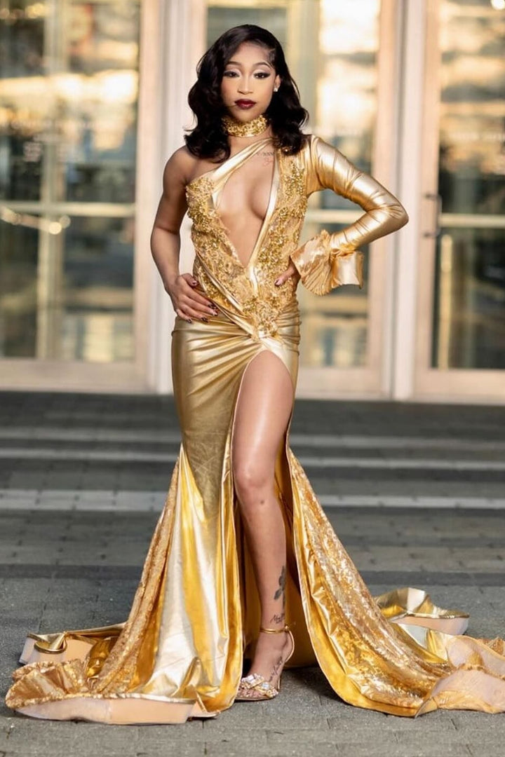 Sexy Bling Gold One Shoulder Appliques Prom Dress with Beadings