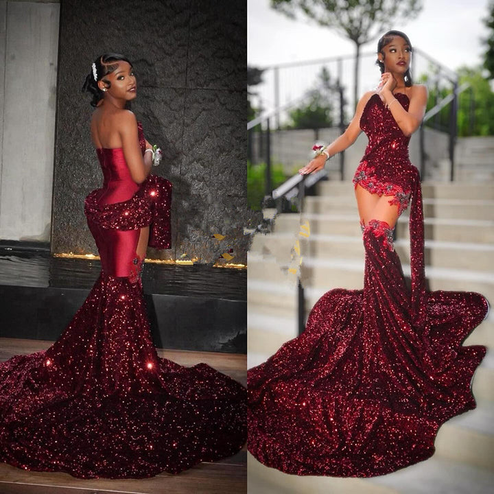 Burgundy Sweetheart Mermaid Sequins Prom Dress with Crystal