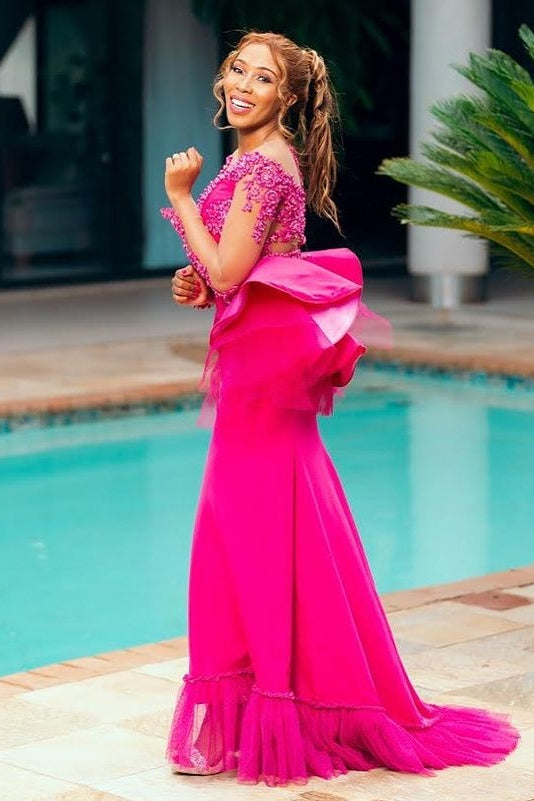 Fuchsia Long Sleeves Appliques Tiered Elegant Evening Dress