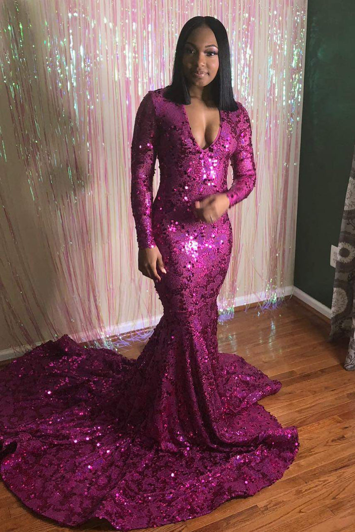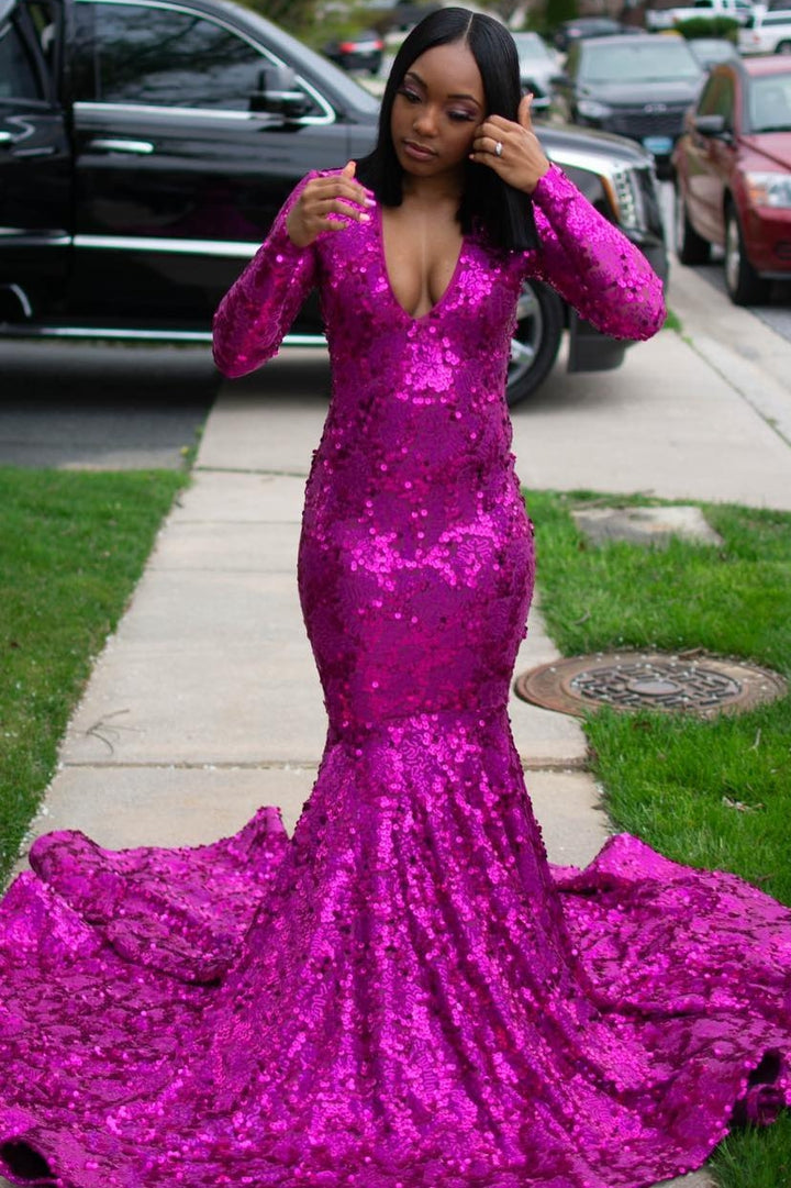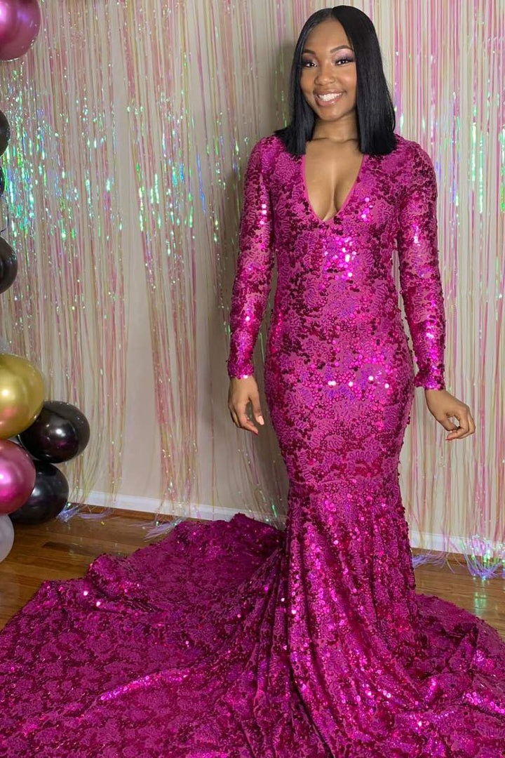 Fuchsia Sequins Long Sleeves V-Neck Prom Dress