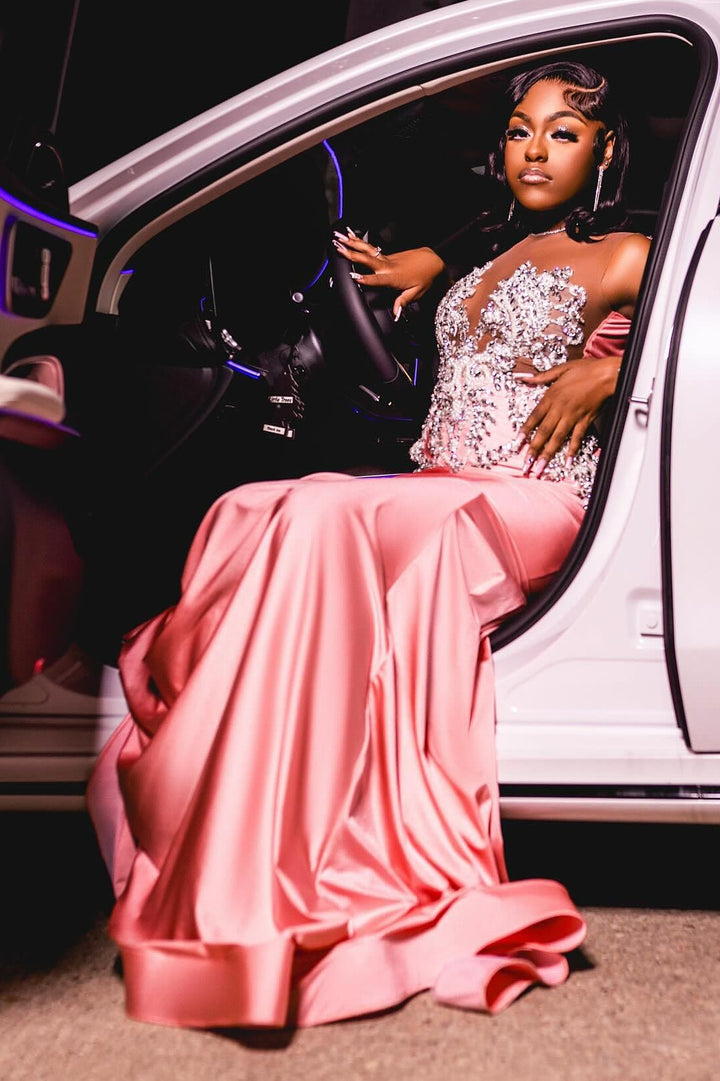 Pink Soft Satin Crystal Mermaid Sleeveless Prom Dress