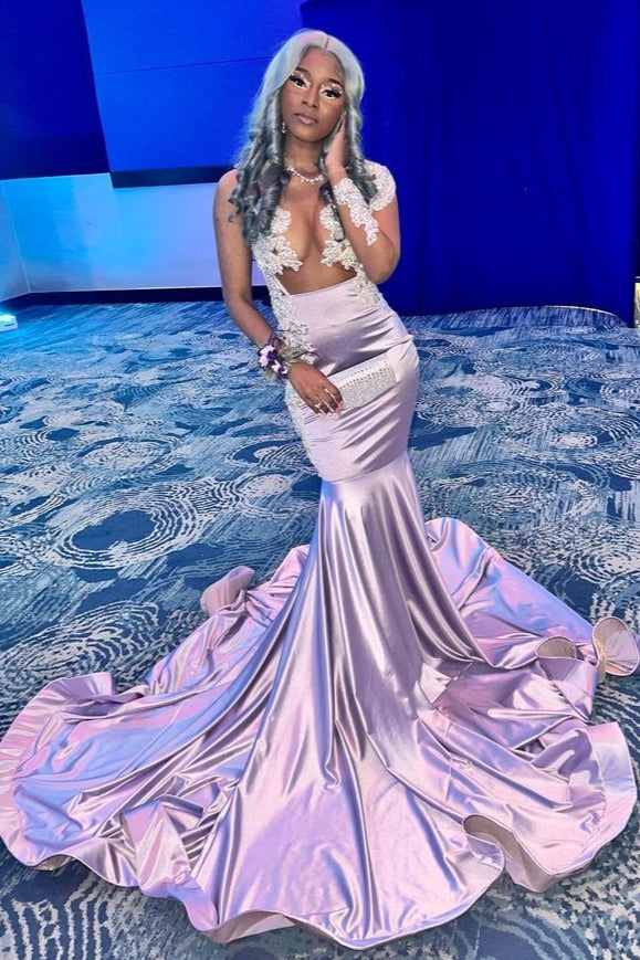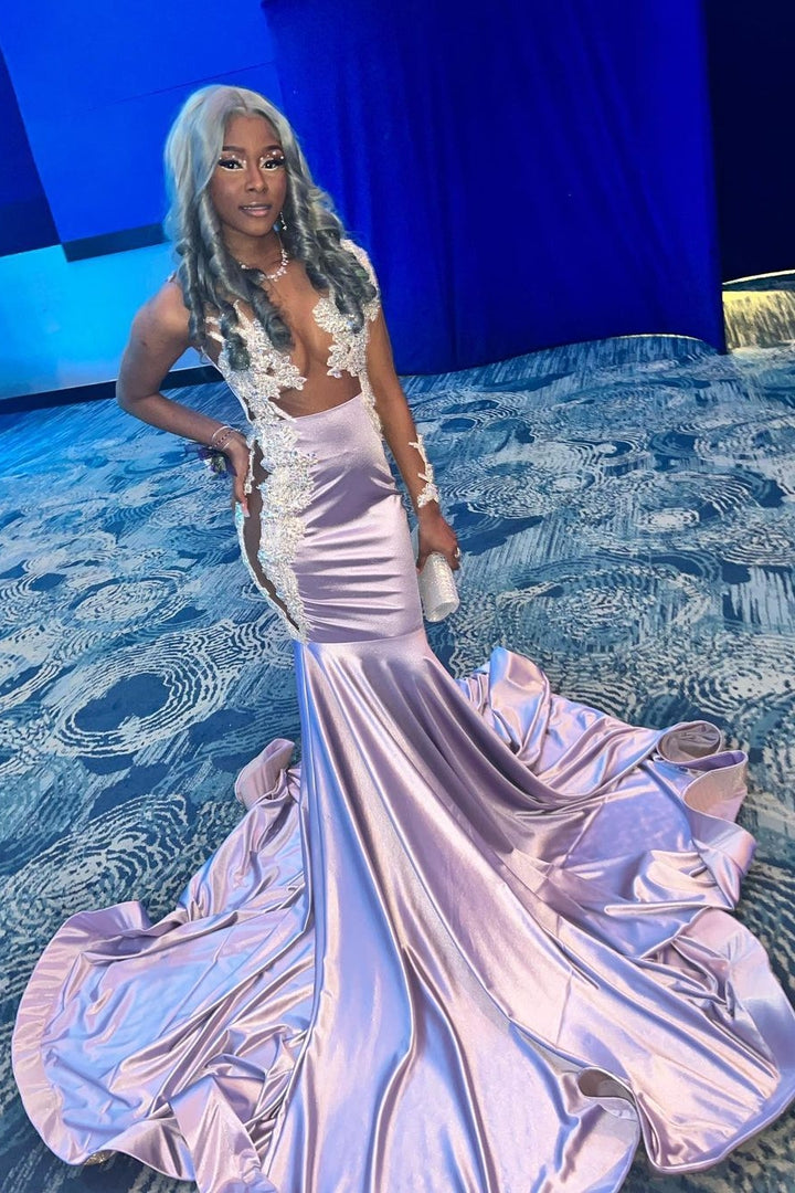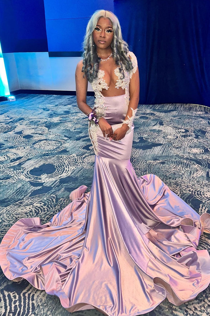 Purple Mermaid Long Sleeves Sheer Tulle Prom Dress