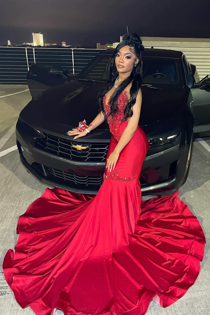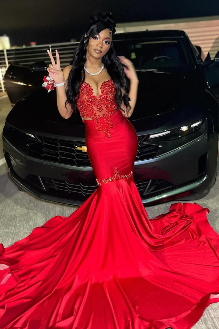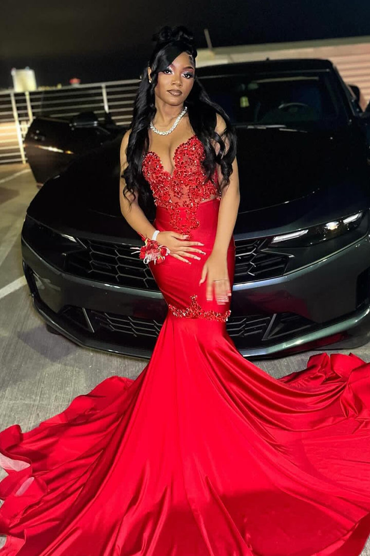 Sexy Glamorous Red Crystal Mermaid Sleeveless Prom Dress