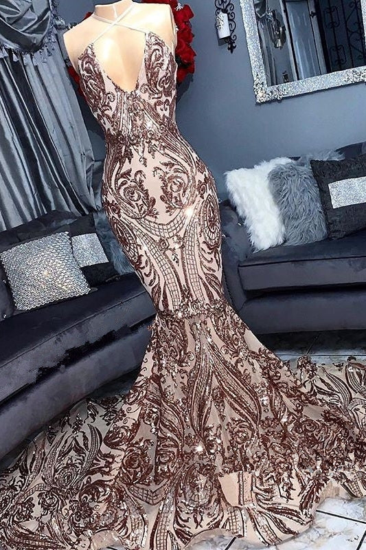 Sexy V-Neck Sequins Sleeveless Mermaid Bespoke Prom Dress