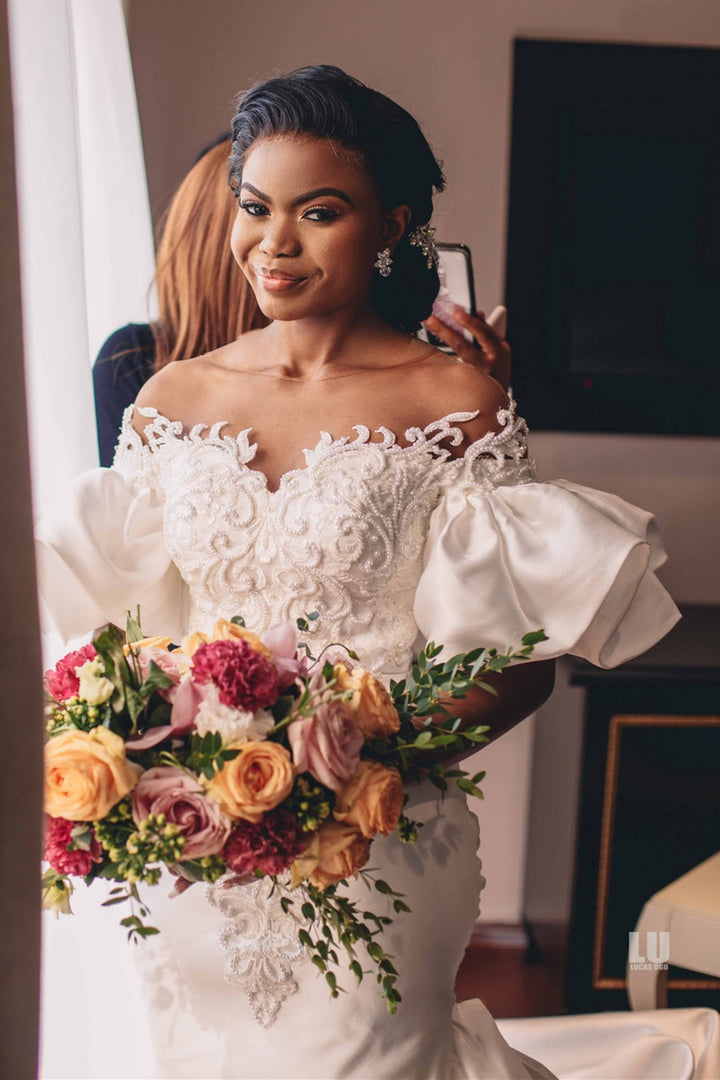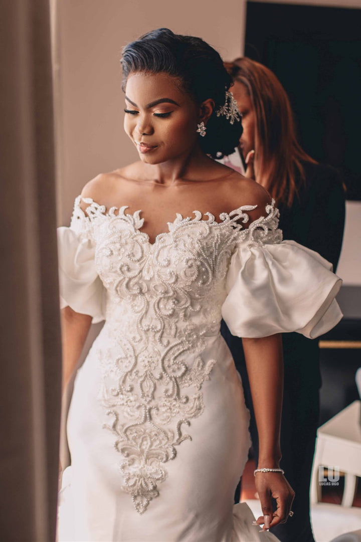 Sheer Tulle Ruffled Satin Beadings Bubble Sleeves Bridal Wedding Dress