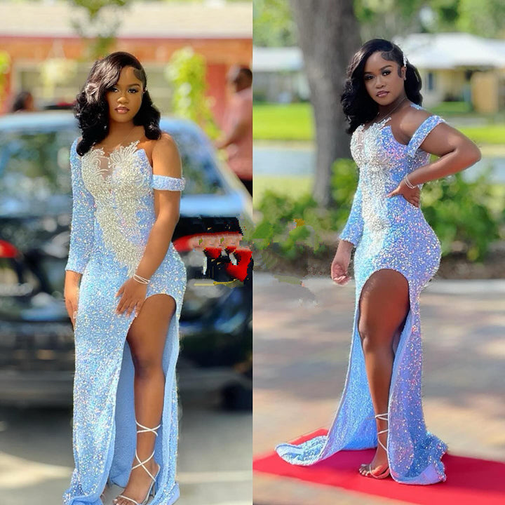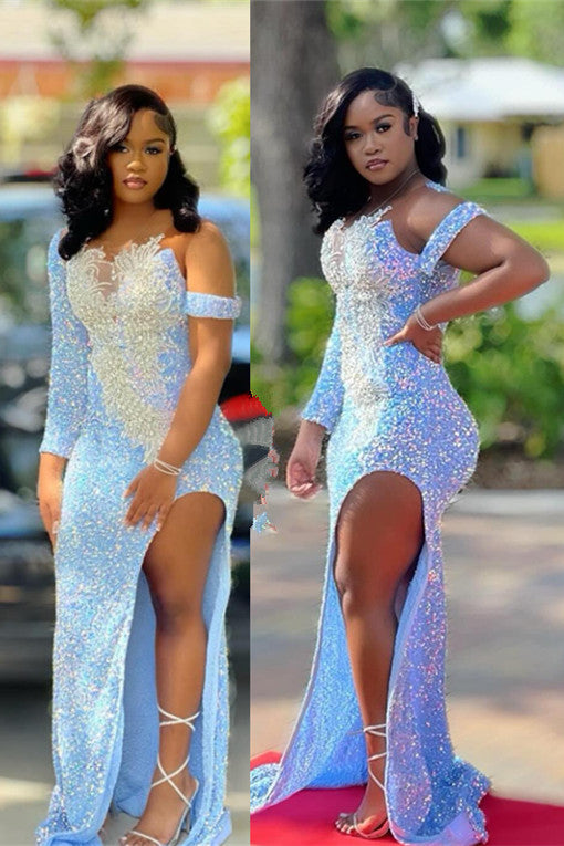 Sky Blue Sequins Side Slit Appliques Prom Dress with Beadings