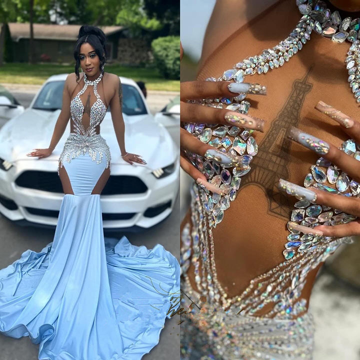 Sky Blue Sheer Tulle Halter Crystal Sexy Prom Dress